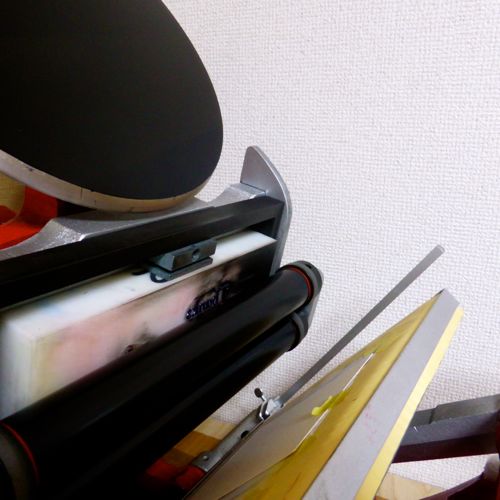 ローラーが上に移動し、版にインキがつきます。
